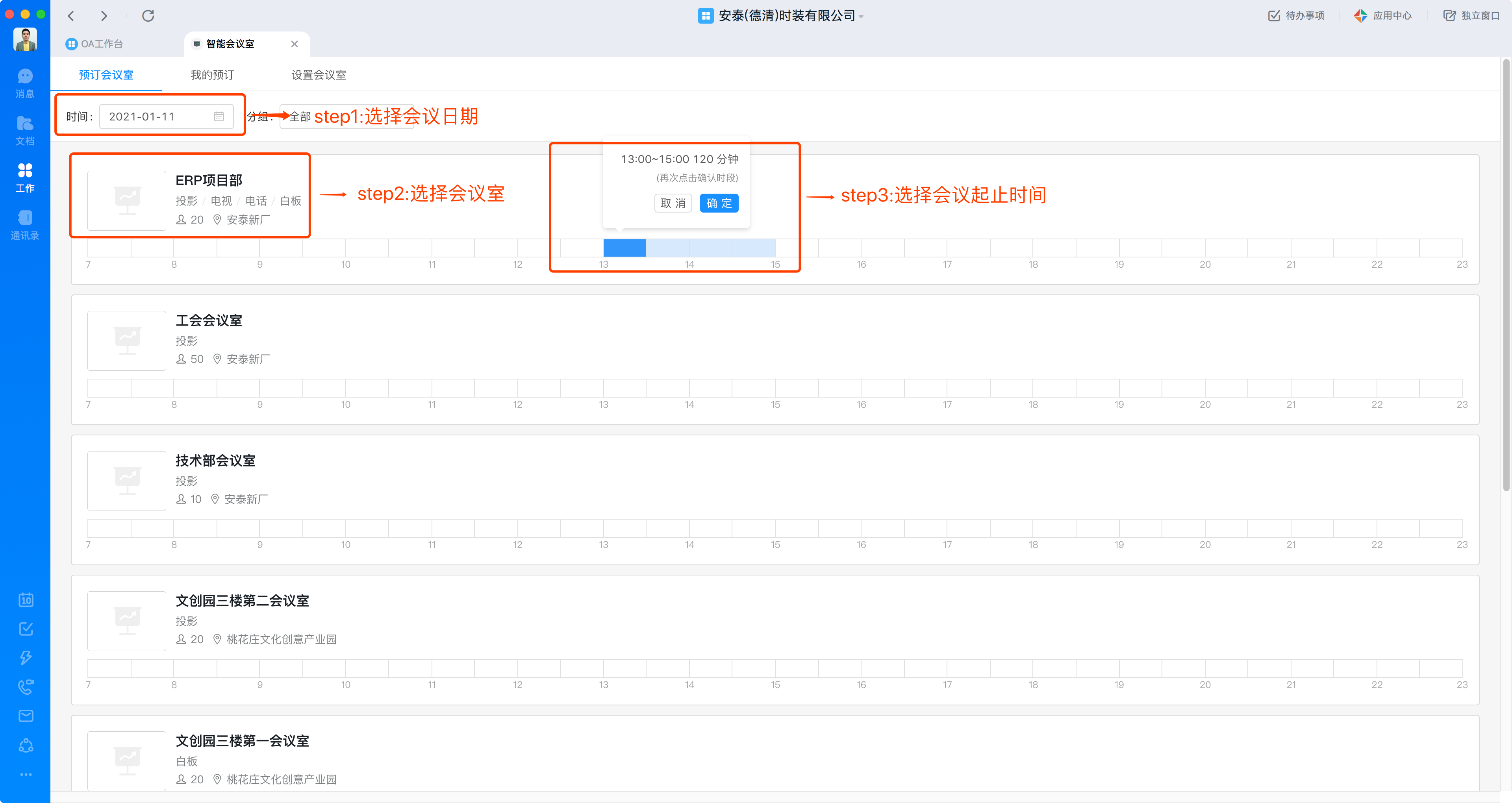 选择会议日期、会议室、会议起止时间,然后点击确定。见图1-2